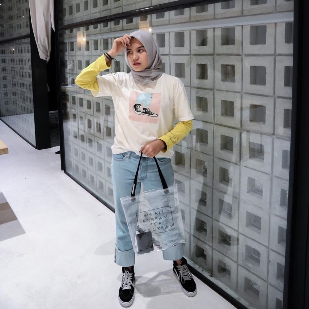 Pilihan kaos oblong dengan motif yang lucu ini emang gak pernah gagal bikin penampilanmu terlihat kece. Apalagi ditambah dengan perpaduan denim, sepatu kets dan tas kekinian.