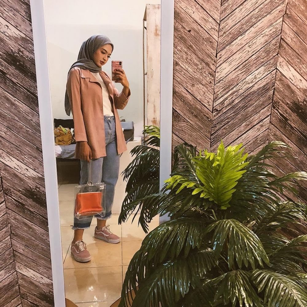 3.Sedikit girly dengan warna dusty pink blazzer dan sneakers. Gaya ini cocok buat kamu yang suka tampil anggun